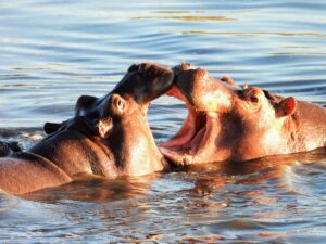 Im Hwange Nationalpark, gucken wir Tiere, sehr amüsant läuft die Hippo-Peepshow ab. Das Männchen umgarnt das Weibchen, es wird geküsst was das Zeug hält, es scheint mit den riesigen Mäulern sehr gut zu küssen sein, anschliessend wird die Umgarnte grob unter Wasser gedrückt und hups rutscht der etwas übergewichtige Liebestolle auf seine nicht weniger schlanke Partnerin. Dabei wird gegrunzt und gequiekt. Auf andere Hippos scheint die Szene Eindruck zu machen denn bald paart sich der ganze Pool.