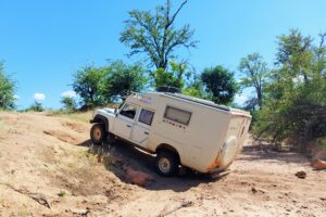 Die grössten Abenteuer erleben wir beim Nordeingang zum Gonarezhou NP. Während wir bereits in der angrenzenden Pufferzone (Zone zw. NP und Landwirtschaftsland) von mürrischen Elefanten angetrompetet wurden, muss sich unsere Schwalbe Randulina in ein Hippo verwandeln denn es gilt, den relativ breiten Save River zu überqueren. Hippos können übrigens nicht schwimmen, sie marschieren unter Wasser. Die Tierwelt und die Landschaft zwischen Save und Rundu Fluss sind traumhaft. Für die weitere Erkundung des Gonarezhou NP überqueren wir auch den Rundu River. Noch breiter und tiefer als der Save. Nur nie in einem Schreckmoment den Fuss vom Gas nehmen, sonst ist die Sache gelaufen und aus Hippo wird Taucherli.