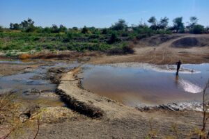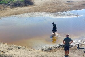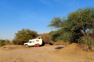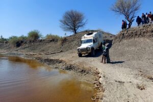 Nächstes Ziel ist der Eyasi See. In der wüstenähnlichen Landschaft wird eine Brücke gebaut, wir bauen unser Wildcamp dort auf. Anscheinend führt der Fluss in der Regenzeit viel Wasser, während die Menschen jetzt in den Trockenflussbetten tiefe Löcher buddeln, um an das wichtige Nass zu kommen. Ausgerechnet eines dieser Flussbette führt aber Wasser und wir müssen dort rüber, und es gibt keine Brücke. Die ansässigen Datogas verwalten diese Furt und verlangen Wegzoll, dafür erklären sie mit Hand und Fuss, wo die Fahrrinne verläuft. Der Untergrund ist zum Glück sandig und nicht matschig und der Wasserstand nicht hoch.
