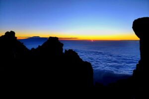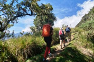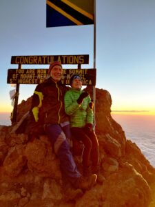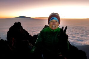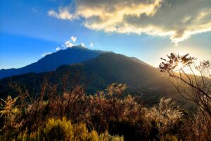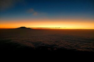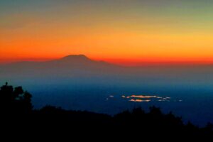 Ich buche bei kiwoitoafricasafaris.com, überweise 2400 US$ erhalte eine Bestätigung für Mr. Meru und eine Ausrüstungsliste für den Kilimandscharo. Ups… kommt das wohl gut? Aber wirklich, am nächsten Tag werden wir vom sympatischen Guide Hasseni und seiner lustigen Truppe abgeholt: Hilfsguide William und Koch Halid. Die 4 Träger werden von den Guides am Eingang zum Arusha Nationalpark rekrutiert, so sichern sich die Dorfbewohner ein Stück der Tourismustorte. Wir buchten eine Privattour, doch es stellt sich heraus, dass wir mit einem bewaffneten Parkranger und anderen Gruppen marschieren, erst der Gipfeltag ist quasi privat, ergo… warten wir…auf den Ranger und die anderen Gruppen. Am Schluss sind wir 6 Schweizer, 2 Israeli, 2 Deutsche und 2 Franzosen, die alle ihre eigenen Führer, Köche und Träger haben. Zur Übernachtung und zum Essen stehen Hütten zur Verfügung, wir werden auf’s beste verköstigt. Unser Koch leistet tolle Arbeit. Die ersten beiden Etappen führen durch Regenwald und auf den Little Meru als Höhentraining. Die dritte Etappe beginnt morgens um 01.15 Uhr mit dem Gipfelaufstieg, den wir kurz vor Sonnenaufgang um 05.45 Uhr erreichen. Was für ein unglaublich eindrückliches Erlebnis. Sogar der Kilimandscharo, das Dach Afrikas, guckt aus dem Wolkenmeer. Der heisse Ingwer-Zitronen-Gipfeltee tut gut, es ist bitterkalt, Pflanzen und Felsen sind mit Rauhreif überzogen. Doch wir stehen auf ehemals heissen Steinen, dem Himmel so nah! Wunderschön gestaltet sich die Abstiegsetappe mit den spektakulären Ausblicken in und um den Vulkan, doch die 2500m Abstieg fahren in die Beine und auf den Gegenanstieg hätte ich gut verzichten können. Ich mag nicht daran denken, dass uns die vierte Etappe anderntags nochmals 1000m Abstieg beschert. Im Nachhinein sind wir doch ein wenig stolz auf uns, denn viel bewegt haben wir uns in Afrika nicht!