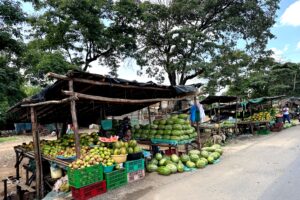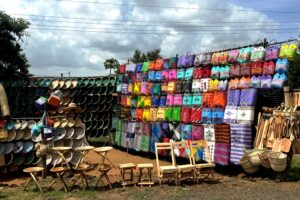 Die Strasse führt der Bahnlinie entlang, die direkten Verbindungen von Mombasa nach Nairobi sind höchstwahrscheinlich gemütlicher als die Strasse. Die Strasse aber lustiger…Korbwaren, Früchte, Gemüse, Baobabs, Sisal, Vom Hosenträger zur Steinschleuder wird alles verkauft, Afrika läuft zur Hochform auf.
