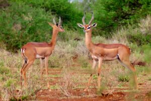 Und dann liegt er vor uns, der Turkana See, der weltgrösste Wüstensee im Rift Valley, wo sich Afrika irgendwann in 2 Teile spalten wird. Seine Ausdehnung ist gigantisch: von Nord nach Süd sind es 250km von West nach Ost 50km bei einer max. Tiefe von 73m. Von 6405km2 gehören lediglich 23km2 zu Äthiopien, von wo aber der Hauptzufluss, der Omo kommt. Obwohl er inzwischen gestaut wird und weniger Wasser in den See fliesst, hat sich der See seit 2010 um 10% ausgedehnt. Der grosse ostafrikanische Grabenbruch bietet eine atemberaubende Kulisse, der Turkana See mit seinem türkisblauen Wasser inmitten einer kargen Vulkanlandschaft aus Lava und Sand und dem Berg Por im Hintergrund. Hier lebt es sich einsam und karg, die Jurten-Hütten vom Wind zerzaust, die wenigen Pisten vom hohen Seespiegel überschwemmt und ausser Fisch, Ziegenfleisch oder Kamelmilch gibt die Natur nichts her. Wir treffen auf eine reich geschmückte Turkana Frau mit ihren Kamelen und einige Fischer. Tropische Nächte rauben uns den Schlaf. Hoch über dem Turkana See steht eine Windkraftanlage mit 365 Windrädern zur Stromerzeugung. Eine sehr futuristisch anmutende Szenerie nach dieser Einfachheit. Doch Kenya braucht den Strom für sein wirtschaftliches Wachstum. Wir geniessen die Wüste mit unzähligen Wildcampspots, erspähen 2 Gerenuks – Antilopen mit Giraffenhälsen – Blumen und Vögel. Einfach, aber wunderschön. Und von den grünen Aberdare’s aus, sehen wir das nächste Objekt unserer Begierde – den Mount Kenya.